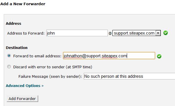 2. Fill in the details of the email address your want to forward on. For example, if you wanted the email account john@yourdomain.com to forward on to johnathon@yourdomain.com, you would enter john in the first field, then johnathon@yourdomain.com in the second field.