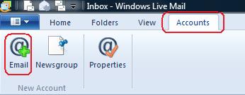 1. With Windows Live Mail open, click on 'Accounts' then 'Email' at the top left of the screen (note - if you don't have an accounts tab you are probably using an older version of Windows Live Mail, try going to 'tools' -> 'account settings' in your menu instead.)