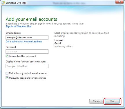 2. A box will come up, enter your email address, password, and make sure to choose the options to remember password and manually configure server settings -> then click the 'next' button.