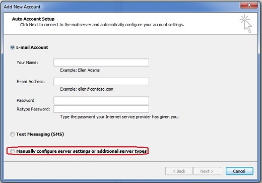 2. On the pop up, choose the option to manually configure your server settings, then click the "next" button