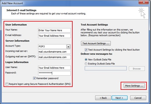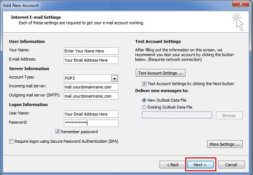 - Deliver Messages To - choose existing data file if you want these messages to go to an existing inbox, otherwise choose new data file if you want to keep these emails separate from any other email accounts you might have set up.