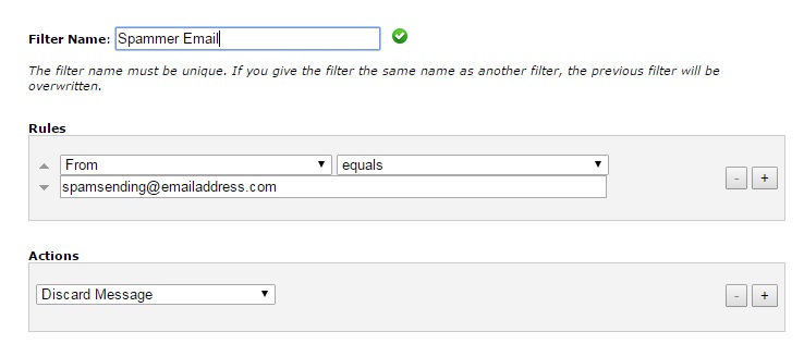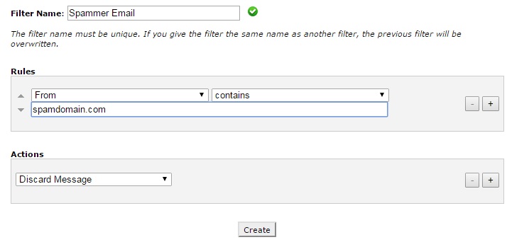 6. Set the 'action' to 'discard message' then click 'create' to save and activate the rule.