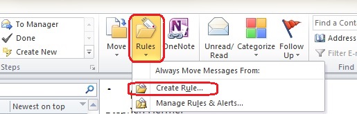 1. With Outlook open, on the 'Home' tab, click the 'Rules' button