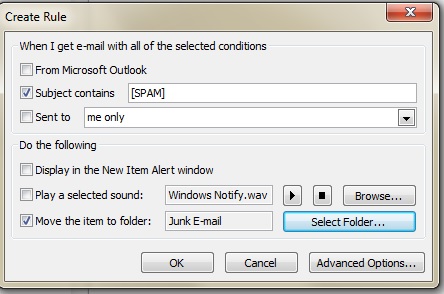 The screenshot below shows a rule that automatically move all [SPAM] email to the junk folder.