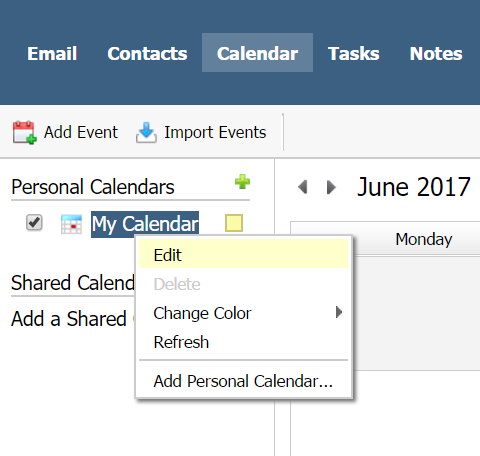 - Right click on My Calendar (or the calendar you wish to share, if different) and select Edit