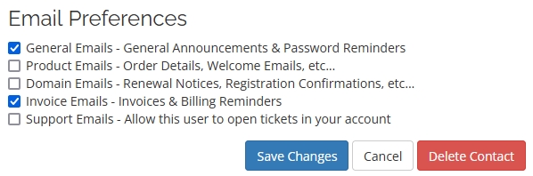 6. Also make sure to set the new contact's permissions and further below their email preferences. If for billing ensure "Invoices" is checked off.