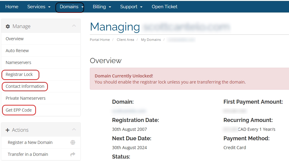 Once update if you are transferring your domain you can UNLOCK the domain (do first) and then send the EPP Transfer code in the domain management area.