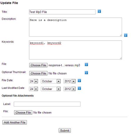3. You will now be on the screen where you can enter details about your new file and also choose the file from your computer for uploading. Below is an explanation of the various fields on the file upload screen. (Remember, you can click the small