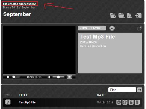 Most browsers will indicate the process as a percentage. When the upload is complete, the page will refresh and go back to the media library and indicate the the file was uploaded successfully (see below).