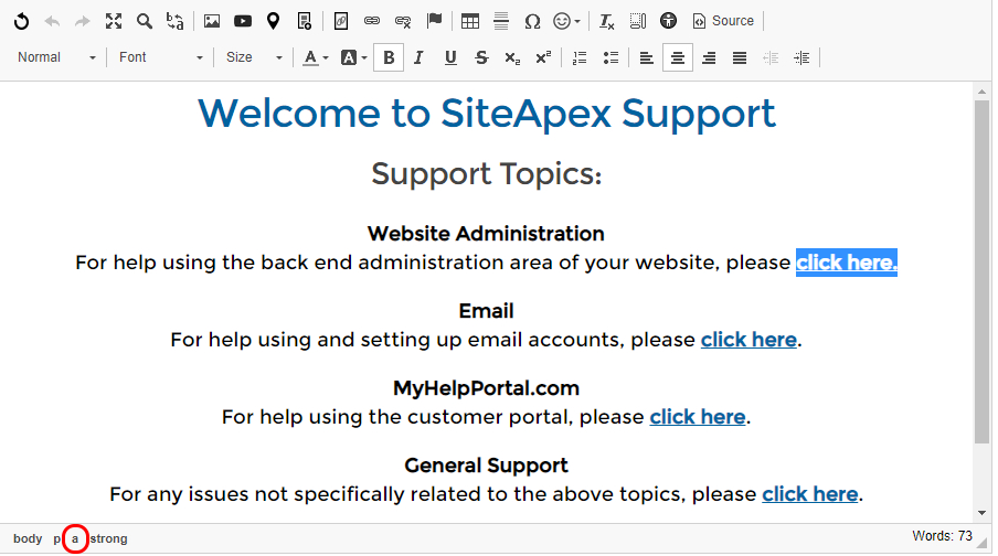 - Scroll down to the tag selector at the bottom of the editor and look for the tag and click it - this should select your link tag so that the whole link is highlighted in the editor.