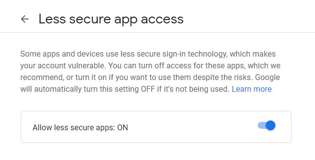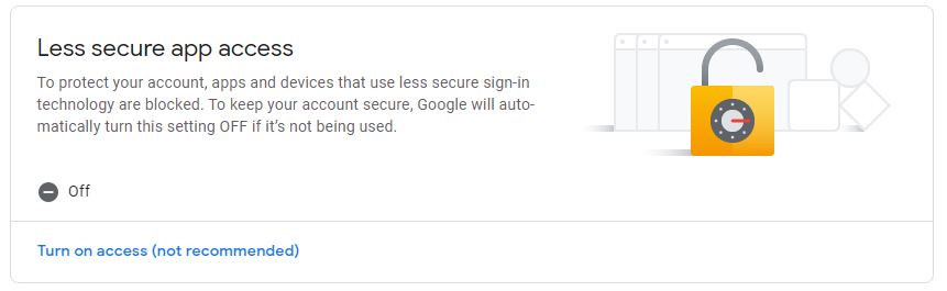 - Scroll down until you see "Less secure app access" and click on "Turn on access". This is the only way to allow a connection without Google blocking it.