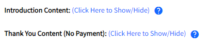 Allows you to add content above your form. This will display above the form on any page you put the form on. Click on Show/Hide to see the content editor.