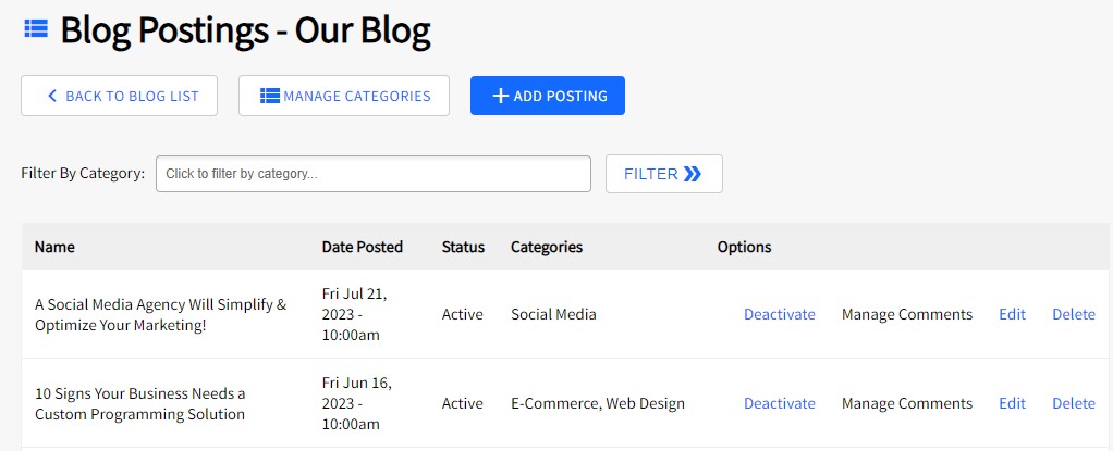 Clicking on Manage Posting will present all the Posts within a Blog. This allow you to modify Posts after the fact.