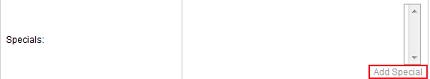 Specials - you can add a temporarily sale or special on your product. If you click the 'add special' link a box will pop up allowing you to enter details about your special (start and end date, sale details, and which products the special should apply to). If you've already created some specials, you can choose which one you want to apply to this product using the list above the 'add special' link.