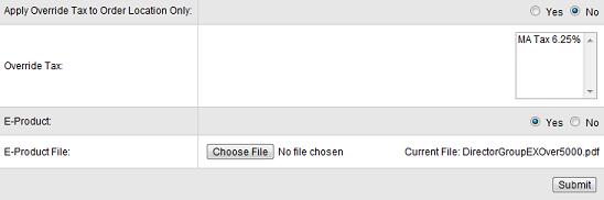 Override Tax - If this product has unique tax rules, you can apply an override tax rule using this field (note that you will need to create the override tax rule first using the 'manage taxes' area of your shop cart. Select the override tax rule you wish to have apply to this product. Leave unselected for none.