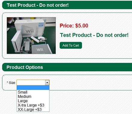 Now that you've added an option group and several options to that group, you should be able to see them on your product in the shopping cart...