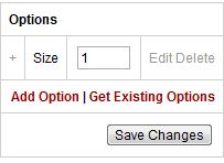 Let's start by creating a option category called 'Size' (you can call your option whatever you wish). First, click the 'manage options' button at the very bottom of the page where you edit your product details in the shopping cart admin area. The button looks like the below image...