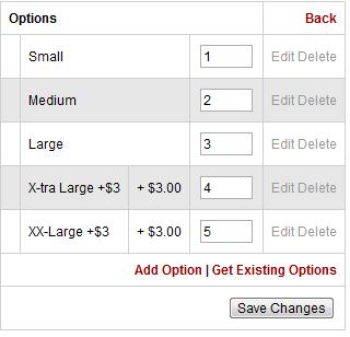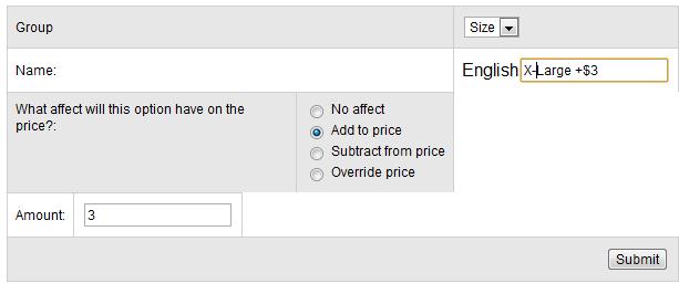 When you're done, click submit. Repeat this process for each option you want to add. In my screenshot below, you can see I've added a total of four options to the size option group I made earlier. I've chosen to charge $3 extra for the x-large and xx-large sizes.