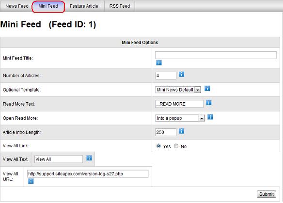 View All URL - Enter the url of the page the your news feed is published on. An example on this can be seen on this website at: http://support.siteapex.com/version-log-s27.php